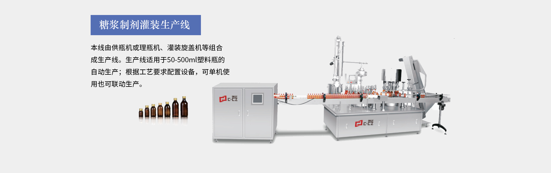 糖漿灌裝生產(chǎn)線適合30ML以上口服液的灌裝生產(chǎn),由供瓶機(jī)、直線式灌裝軋(旋)蓋機(jī)、立式貼標(biāo)機(jī)等設(shè)備組成,可全自動(dòng)完成灌裝、上蓋、旋(軋)蓋、貼標(biāo)等工序。主要用于制藥、食品、化工的的各種液體物料的灌裝聯(lián)動(dòng)生產(chǎn)。本生產(chǎn)線完全符合GMP要求。糖漿灌裝生產(chǎn)線特點(diǎn)裝量特征:無(wú)滴漏、不起泡、不飛濺。運(yùn)行特征:運(yùn)行穩(wěn)定,噪音小;灌裝精確,能耗少,破瓶率低,成品合格率高性能特征:整條生產(chǎn)線可單機(jī)控制和聯(lián)鎖控制。洗瓶...